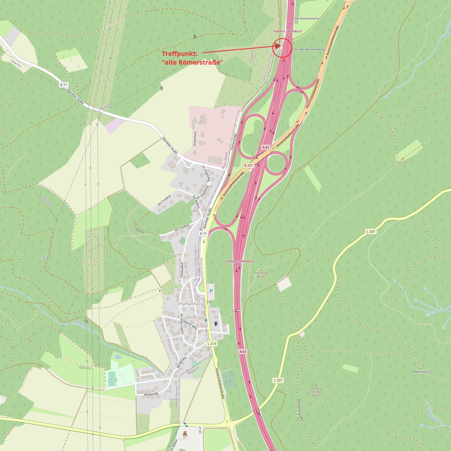 Wir treffen uns um 19 Uhr an der Autobahnunterführung "alte Römerstraße" (Hunsrückhöhenstraße), ca 1,5 km hinter der Wäscherei Diener in Pfaffenheck (siehe unten).